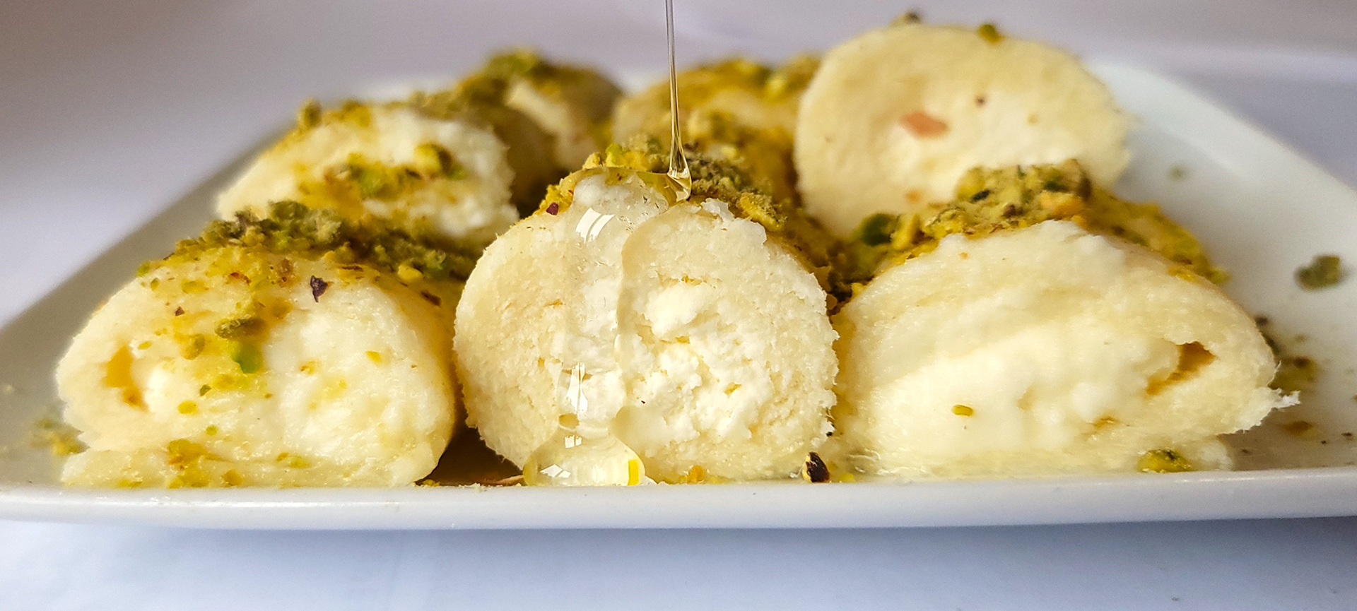 A classic Levantine dessert delicate and melt-in-the-mouth known as Halawet el Jibn is an exquisite dessert of cheese and semolina dough stuffed with custard cream (ashta) and adorned with pistachios topped with rose scented sugar syrup.