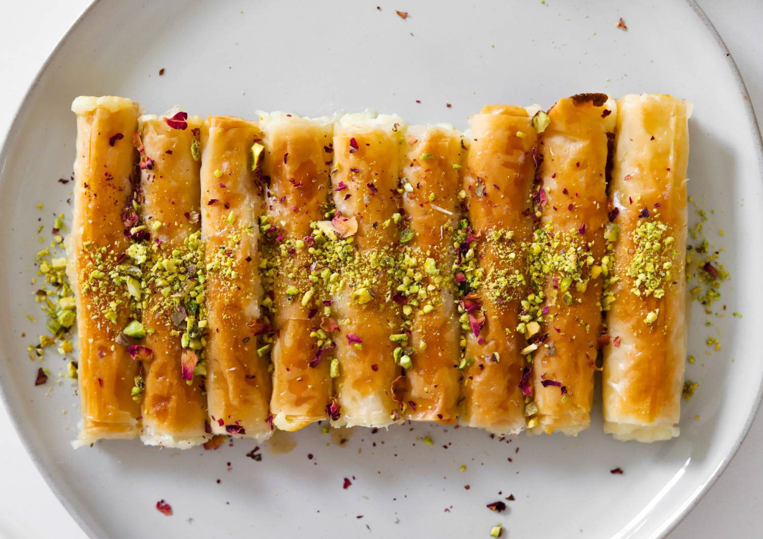 It is a phyllo roll stuffed with the most delicious custard cream (ashta) and doused with sugar syrup and ground pistachios. It’s basically a cream filled baklava.